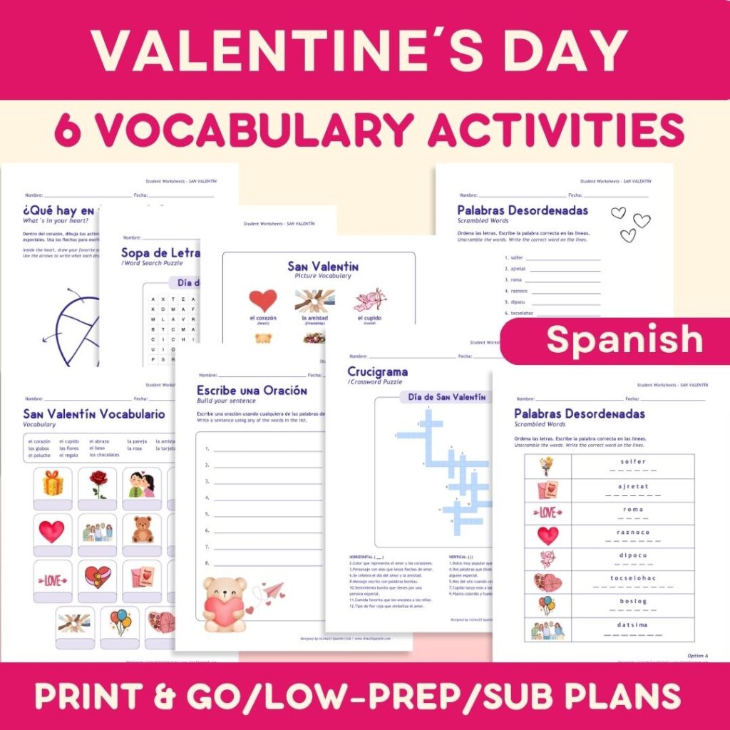 Sometimes you need structured, print-and-go activities that still feel engaging. These Valentine’s Day Spanish Worksheets are designed to help students practice reading, writing, and sentence building while learning vocabulary related to love and friendship.